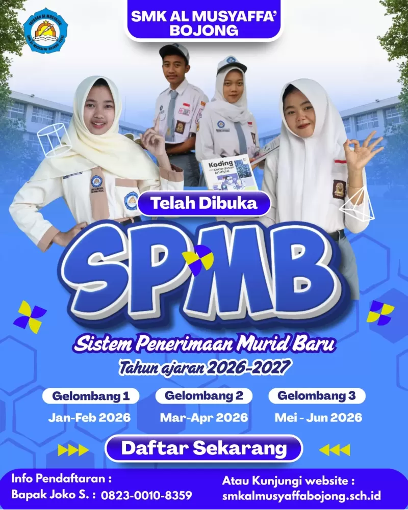 Pendaftaran Sistem Penerimaan Murid Baru (SPMB) untuk tahun ajaran 2026/2027 terbaru kini resmi dibuka di SMK Al Musyaffa Bojong. Tidak hanya menawarkan pendidikan berbasis kejuruan yang kompetitif, sekolah juga menghadirkan promo spesial bagi para pendaftar yang melakukan registrasi/pendaftaran lebih awal.